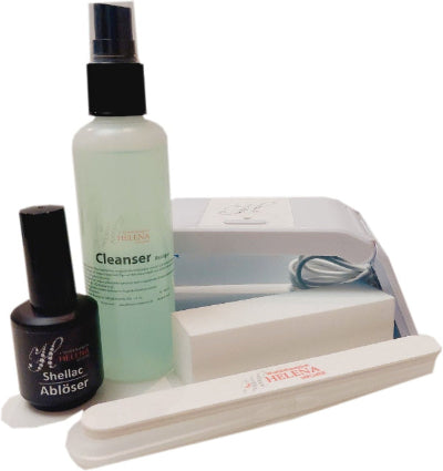 Inhalt je 1 x : LED Mini Lampe, Cleanser 100 ml, Shellac Ablöser 15 ml, Kundenfeile, Buffer;